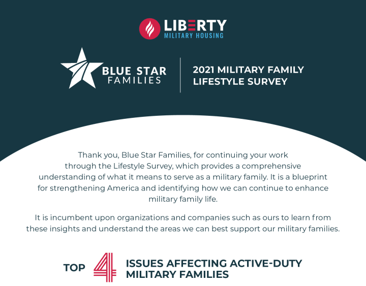 Since 2009 Blue Star Families has administered the Military Family Lifestyle Survey to provide a comprehensive understanding of the experiences and challenges encountered by military and Veteran families. The data collected from the annual surveys help organizations, and companies like Liberty Military Housing better understand where we can support military families and create thriving military communities.