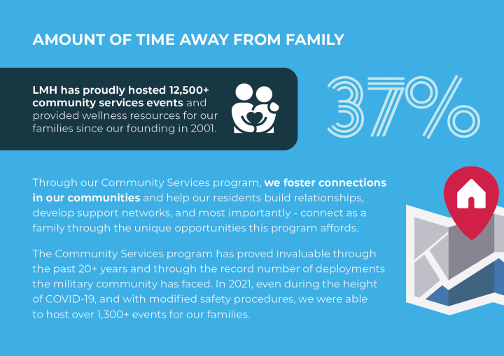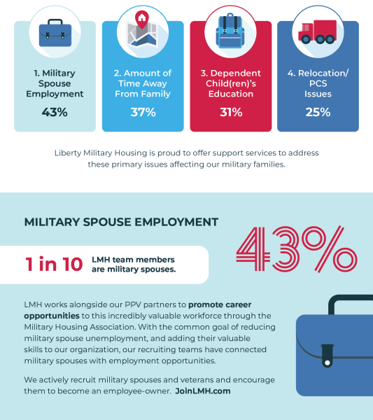 Since 2001, LMH has provided military families with more than just homes. We aim to build thriving military communities. Surveys such as the annual Military Family Lifestyle Survey help us take the military community's pulse and understand where we can better support. Learn more about the top four issues impacting military families today and learn what LMH is doing to support the military community.
